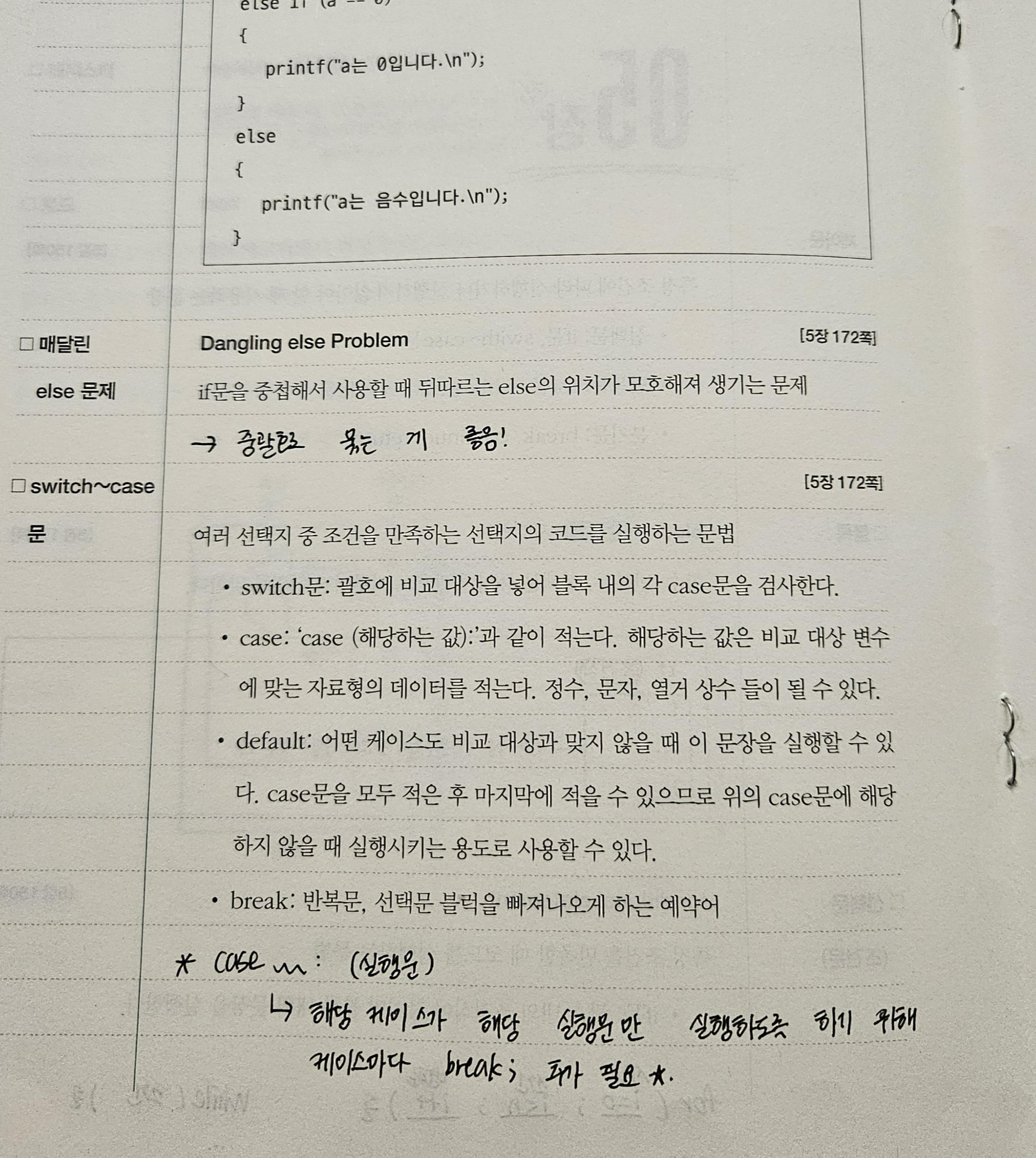 case에 해당하는 경우, 그 아래의 실행문 만 ! 실행되어야 하기 때문에, case는 break;를 포함해야 한다. break;는 해당 블록을 탈출하는 데 사용되는데, 블록의 기준은 중괄호로 묶이는 부분이다. (해당하는 경우 전부 실행되어야 하면 break를 생략하기도 함)