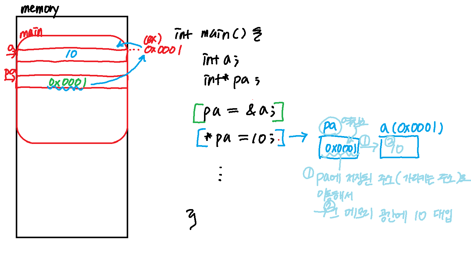 포인터 변수에는 '주소 값'만 저장할 수 있음. 포인터 변수 pa에 변수 a의 주소를 저장하면, '포인터 변수 pa가 변수 a를 가리킨다.' 라고 표현.